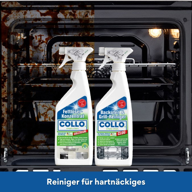 Entdecke eine vielfältige Auswahl an hochwertigen Reinigungsmitteln bei COLLO. Dein Zuhause verdient das Beste, wenn es um Sauberkeit geht. Mit COLLO erlebst Du Reinigungsmittel, die nicht nur effektiv sind, sondern auch deine Reinigungsaufgaben spielend einfach machen. Stelle dir vor, wie hartnäckiger Schmutz und Fett mühelos verschwinden, und Ihre Oberflächen in neuem Glanz erstrahlen. Unsere Kollektion von Kochfeldreinigern, Fettlösern und Backofenreinigern setzt neue Maßstäbe in der Reinigungsleistung. Deine Zeit ist kostbar – gönne dir die Leichtigkeit der Reinigung mit COLLO.